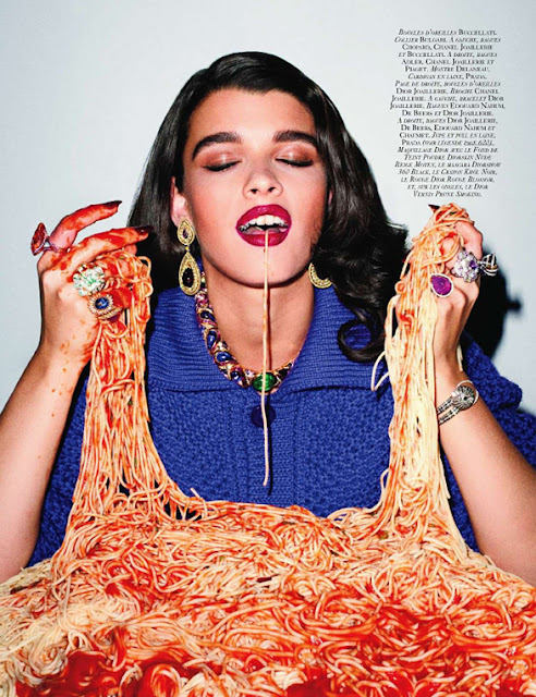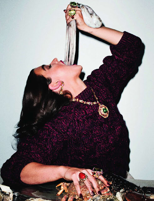 Legalábbis Carine Roitfeld stylingja szerint. Terry Richardson fotózta le napjaink legismertebb plus-size modelljét Crystal Rennt a Vogue Paris számára amint épp tintahalat töm a szájába, spagettibe markol, sonkát szel, csirkecombot szopogat vagy épp hurkát tűz a villájára.