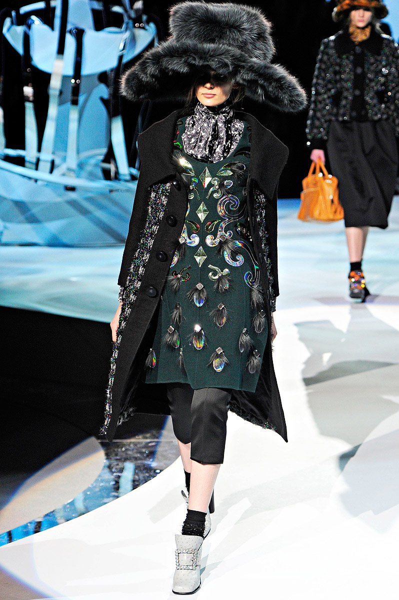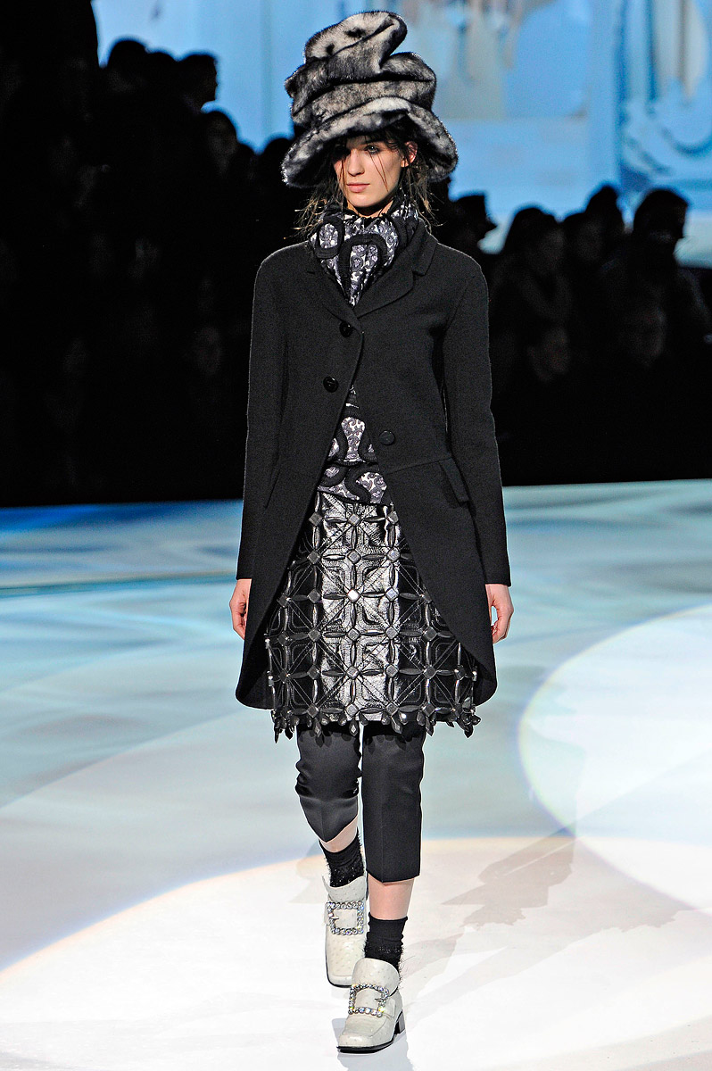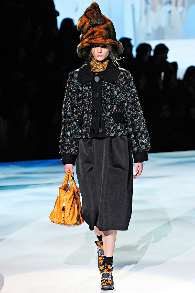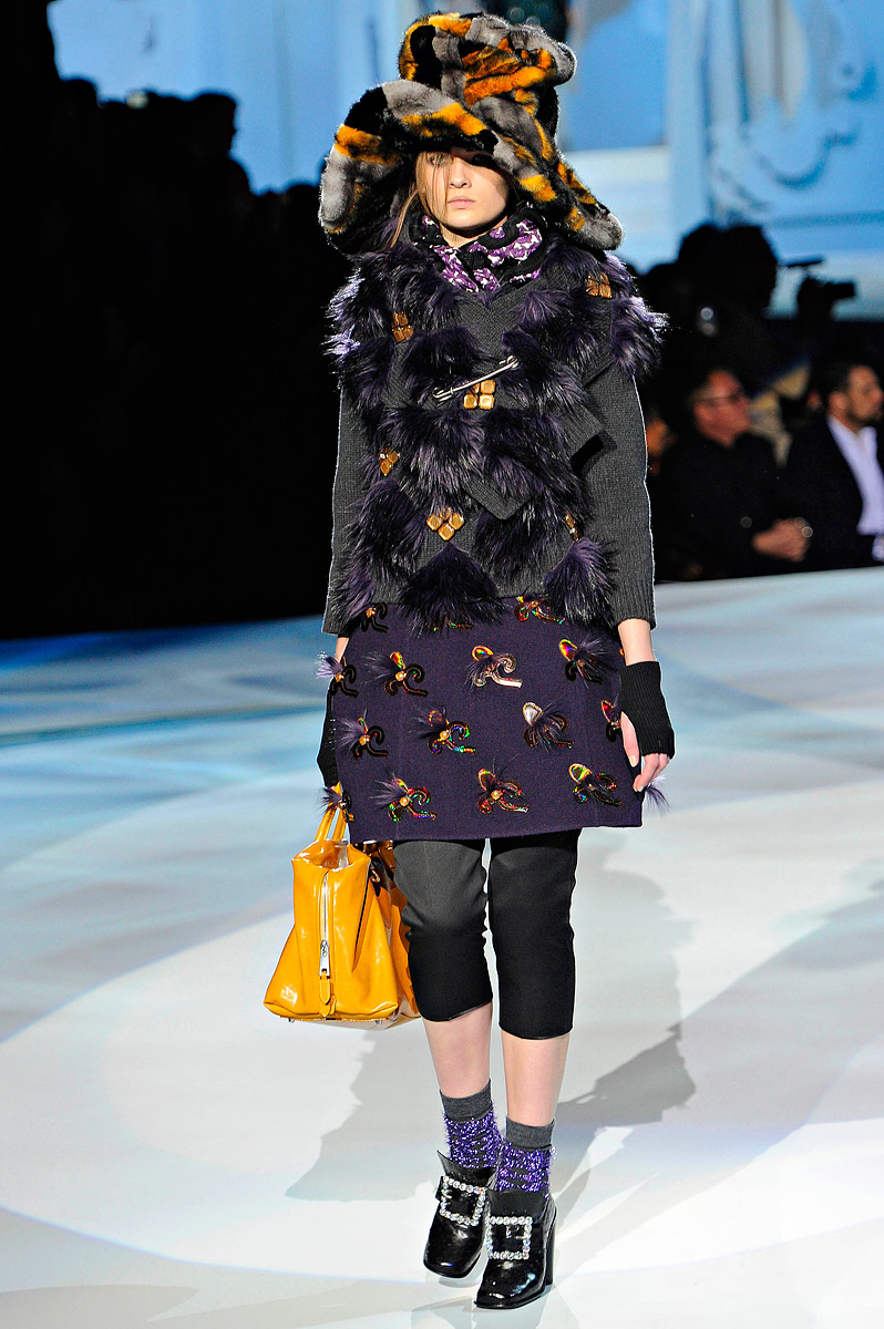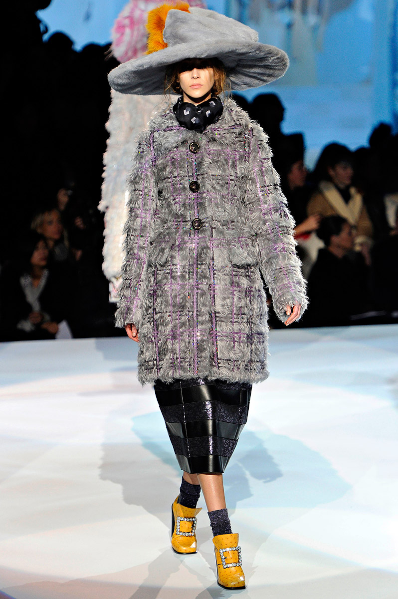 Marc Jacobsnak is ugyanaz a boszorkányos mesekönyv akadhatott a kezébe mikor a jövő őszi kollekciót vetette papírra, amit én is oly nagy előszeretettel lapozgattam kiskoromban. Vagy egyszerűen csak viccel, kipróbálja, hogy tényleg mindent felvesznek-e a divatőrültek, csak mert egy menő címkét varrtak bele. Persze azért erre én is kíváncsi vagyok, ki lesz az első eszement, aki majd giga-mega vattakalapban szaladgál... Nagyon toleránsnak tartom magam a divat terén (ráadásul a klasszikus vonalak is viszonylag távol állnak tőlem) de ezen a kollekción én is hangosan felnevettem. A modellek telőtől talpig rémes iszonyatba vannak burkolva, kezdve a hatalmas szőrös fejfedőkkel, befejezésképpen pedig a strasszos csatos kalózcipővel. A köztes terület már ugyan nem égeti ki a szemem, de egy pillanatra sem feledteti a megrázó élményt, amit legalul vagy legfelül szemrevételezhettem.
