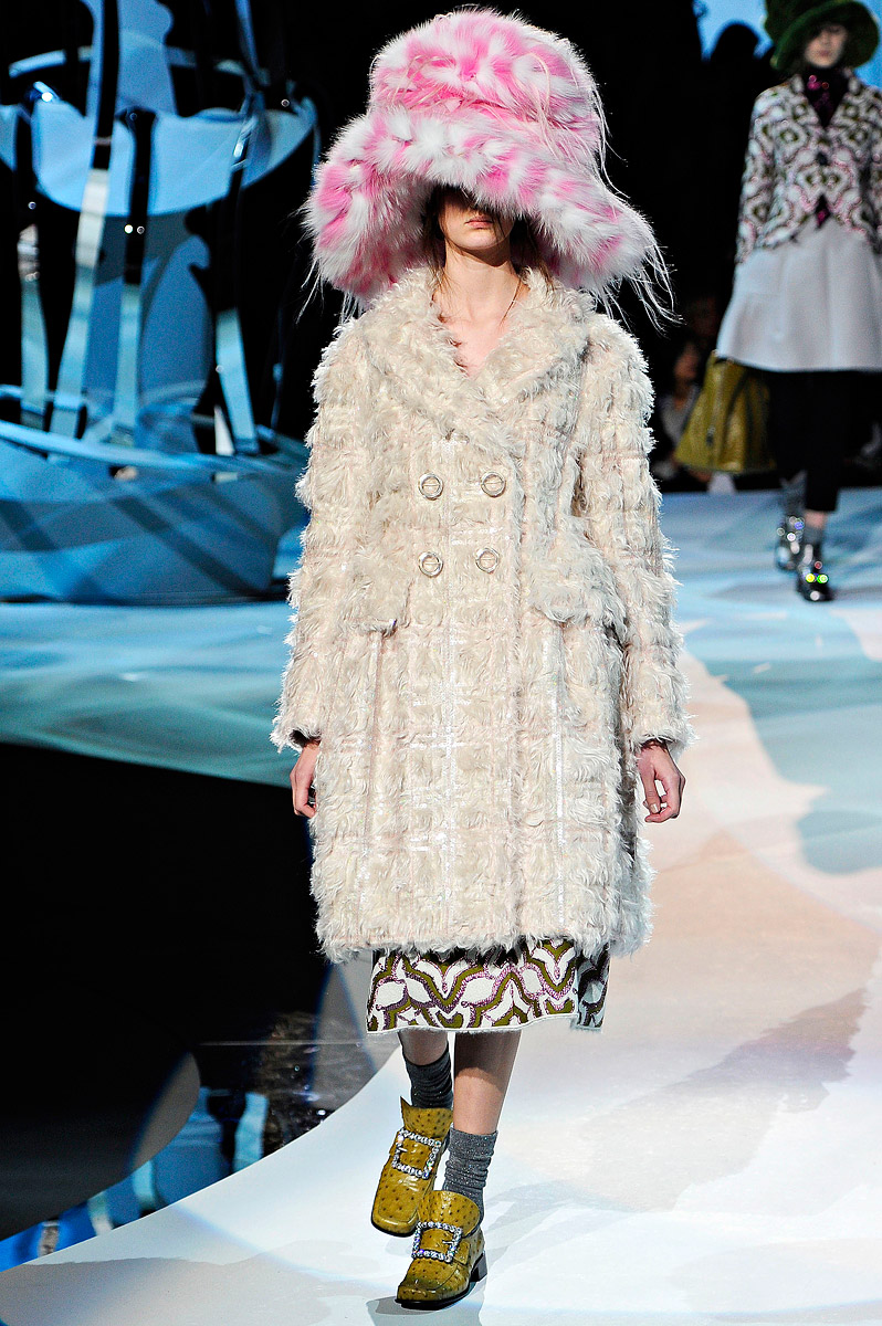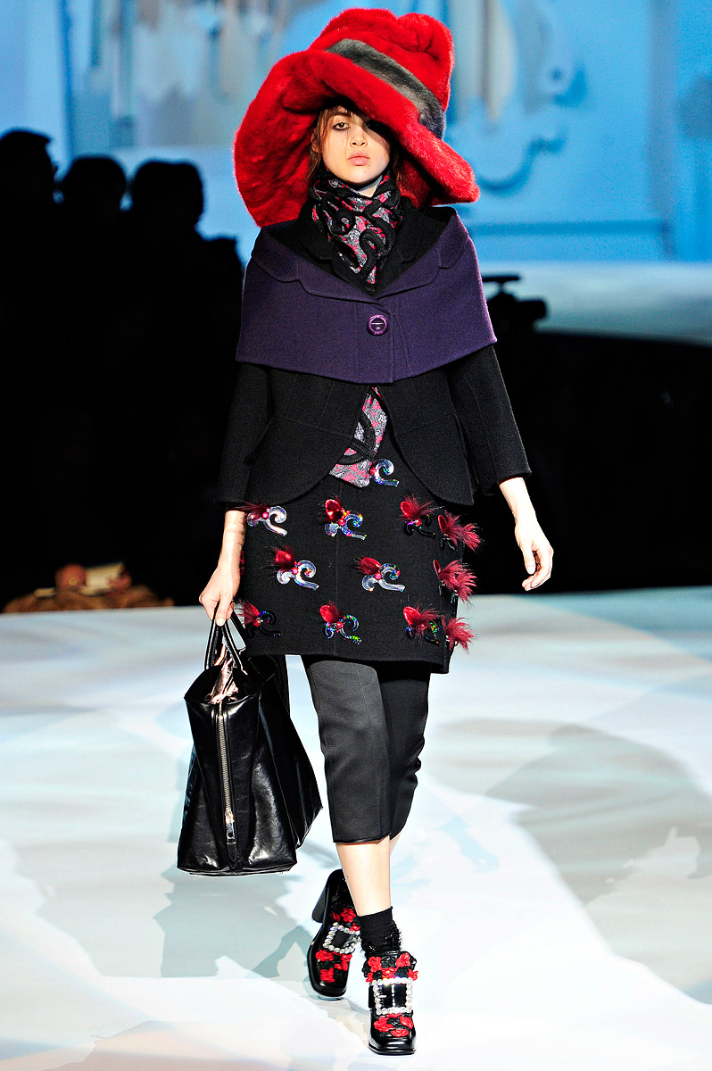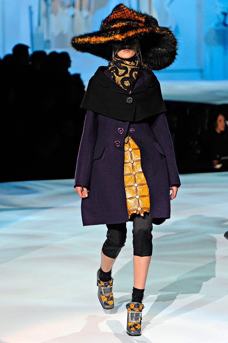 Marc Jacobsnak is ugyanaz a boszorkányos mesekönyv akadhatott a kezébe mikor a jövő őszi kollekciót vetette papírra, amit én is oly nagy előszeretettel lapozgattam kiskoromban. Vagy egyszerűen csak viccel, kipróbálja, hogy tényleg mindent felvesznek-e a divatőrültek, csak mert egy menő címkét varrtak bele. Persze azért erre én is kíváncsi vagyok, ki lesz az első eszement, aki majd giga-mega vattakalapban szaladgál... Nagyon toleránsnak tartom magam a divat terén (ráadásul a klasszikus vonalak is viszonylag távol állnak tőlem) de ezen a kollekción én is hangosan felnevettem. A modellek telőtől talpig rémes iszonyatba vannak burkolva, kezdve a hatalmas szőrös fejfedőkkel, befejezésképpen pedig a strasszos csatos kalózcipővel. A köztes terület már ugyan nem égeti ki a szemem, de egy pillanatra sem feledteti a megrázó élményt, amit legalul vagy legfelül szemrevételezhettem.