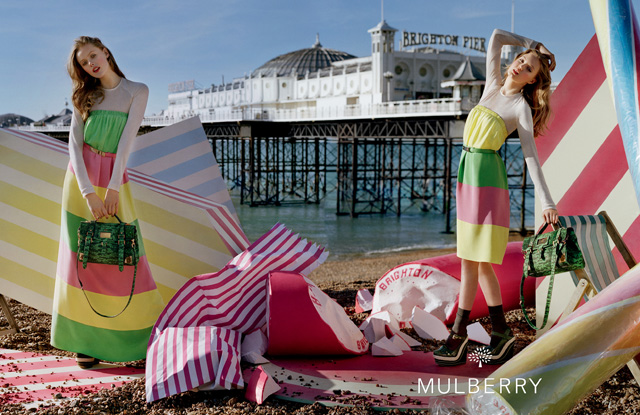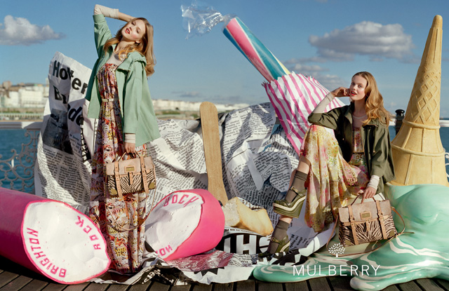 A Mulberrynél viszont már MINDEN a fagyikról szól: a színek, a gigászi tölcsérdekorációk, az olvadó krémes nyalánkság és a cukorkák mindent beborítottak Brightonban, a fotózás helyszínén. Csodásak a táskák, isteni Lindsey Wixson mosolya, már csak egy tömött pénztárca kellene a mennyországhoz!